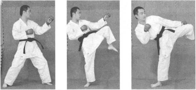 【要点)直线提膝,膝关节尽量抬高,身体可稍向后仰,重心须在后腿上,