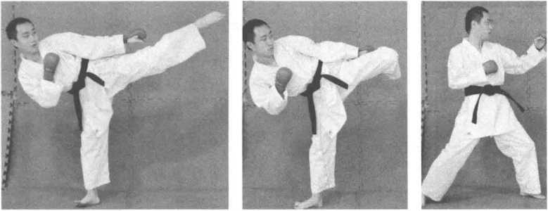 以左架站立为例,左腿支撑,右腿提膝;同时右脚向外旋转,脚面绷直,上体 可稍向后倒,膝盖朝向上方;接着大腿带动小腿快速的鞭打对方头部,击打点为脚 的背面;击打出后,迅速收回。还原预备实战架。(图3-5-21 ~图3-5-26)