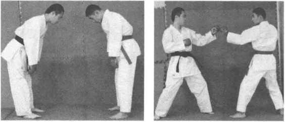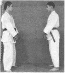 1 .两人面对面站立,互相致礼,预备实战架.(图3-6-1 ~图3-6-3)