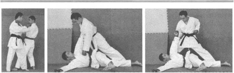 2 .移动重心,支撑腿迅速移动并靠近对手,同时出手抓住对手的道服,用另一 条腿挑踢起对手的支撑腿,破坏对手的重心。(图3-6-4)