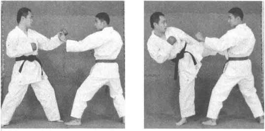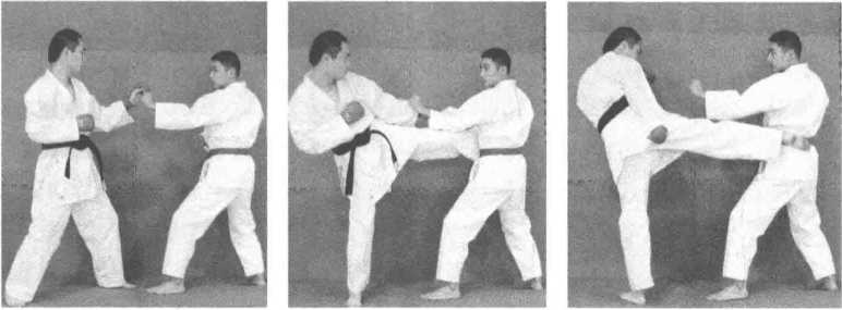 3 .然后立即重心移至后腿,快速前腿挂踢踢击对方头部。(图3-7-20 ~图