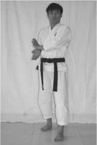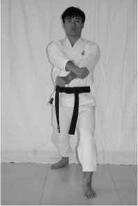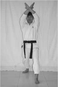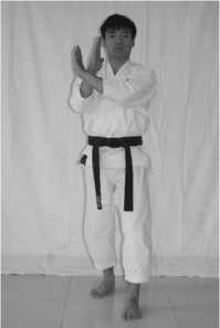 3 .The movement of hands: change your fists into knife hands; block the upper level with the crossed knife hands (the left knife hand is at the outside)