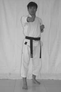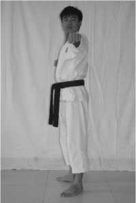 2 . The standing means: the two legs keep upright 3.The movement of hands: withdraw the two knife hands to the front of the right waist (the left hand is in the upper,the center of the left palm downward,the center of the right palm is to the front)