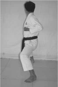 3 .手部动作:双拳低位 交叉格挡(右拳在上, 两拳心向下)