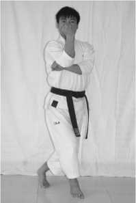 3 .手部动作:两拳低位 交叉格挡(右拳在上, 两拳心向下)