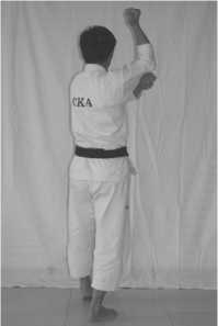 3 .The movement of hands: act the middle area outside block with your right fist,put the right elbow upon the left fist (the axis of the fist faces downside)