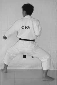 1.The movement of feet: axis of left foot,body makes a rotation of 180° 2.The standing means: stand in a horse stance 3.The movement of hands: make a left low block, right fist locates below the armpit 4.Direction:D1