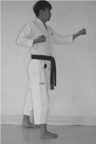 3 .The movement of hands: left fist makes a median attack, heart of fist up, right hand open, in front of the abdomen, fingers up