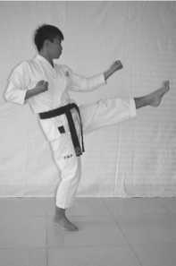 1 .The movement of feet: make a left median kick, both fists keep still as before