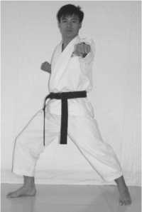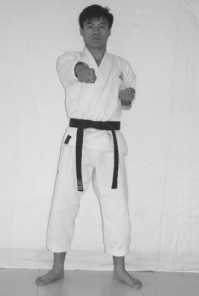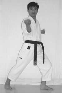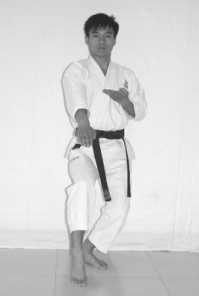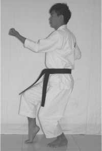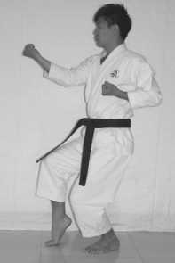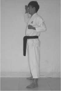 3 .The movement of hands: blocking the lower section with the back of the right fist, withdraw the left fist to your left rib;