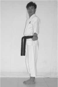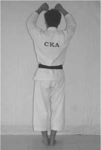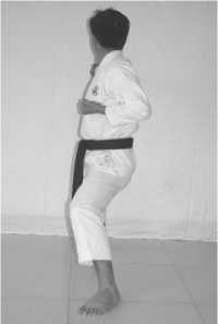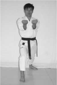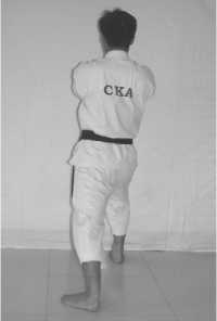 3 .The movement of hands: change the two knife hands into fists and put them before forehead, block the upper section of your body with the fists (boxing heart forward)