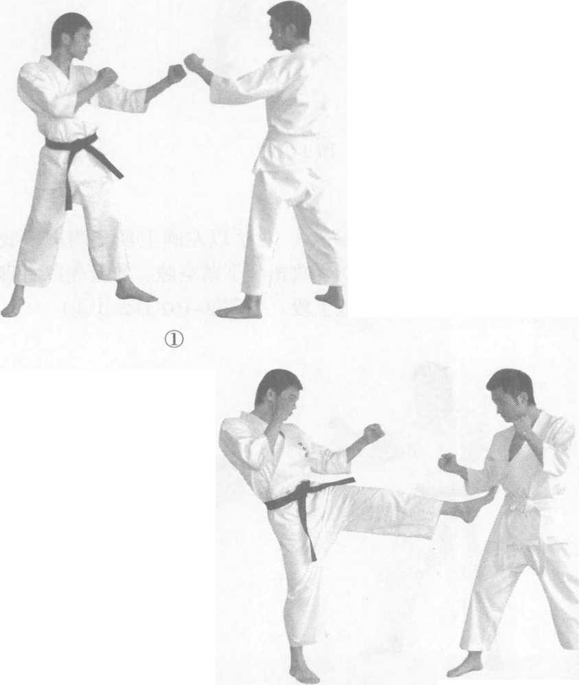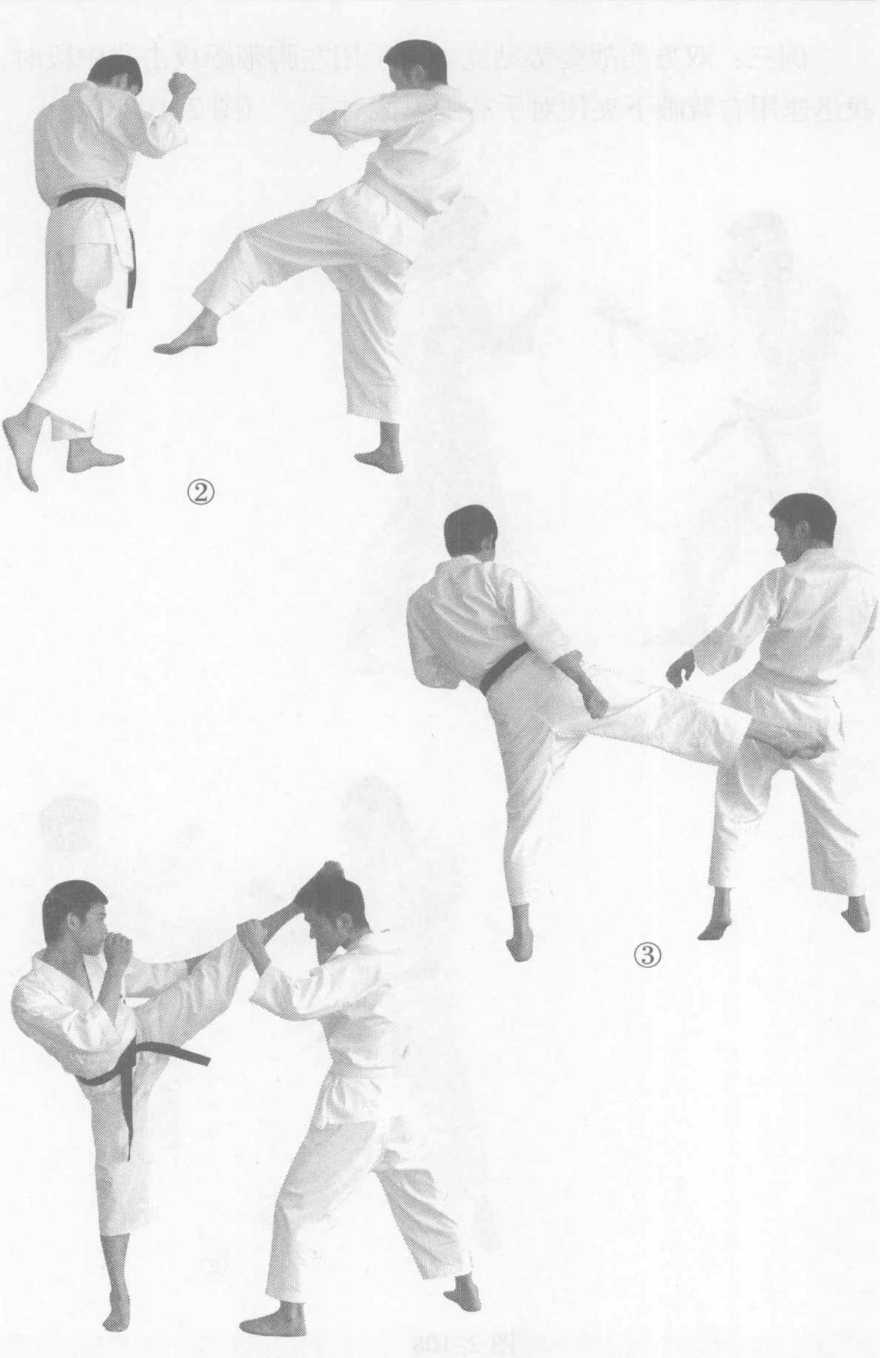 躲闪势鞭踢是空手道选手较常用的反击技术。【实战作用】例一:双方实战姿势站立。对手用左脚前踢时,我前脚迅 速后撤闪躲,趁对手落步之际,我迅速回身以鞭踢反击对手身 体中段。(图2-106①②③)②图 2-106例二:双方实战姿势站立。对手以左腿上段鞭踢进攻我 时,我迅速撤步躲闪,趁对手攻击腿下落空隙,我抢先以右脚 或左脚鞭踢攻击对手中段或上段。(图2-107①(2)③④)①④