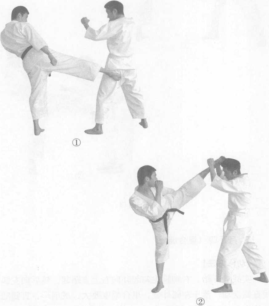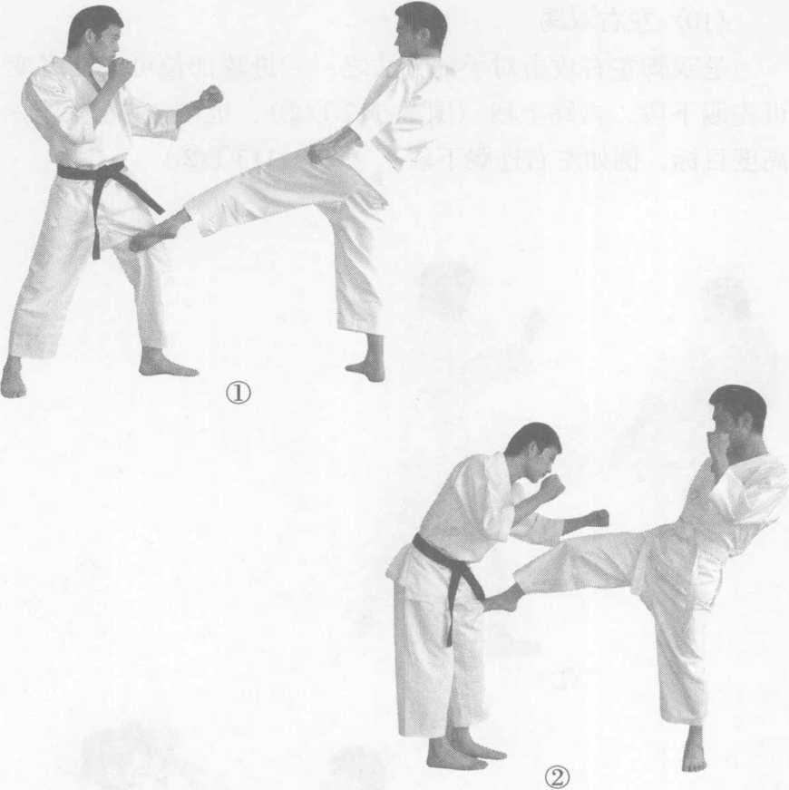 是双脚左右攻击对手的方法之一。进攻部位可灵活多变, 可先踢下段,再踢上段(图2-L12①②),也可左右连踢同一 高度目标,例如左右连踢下段。(图2-113①②)