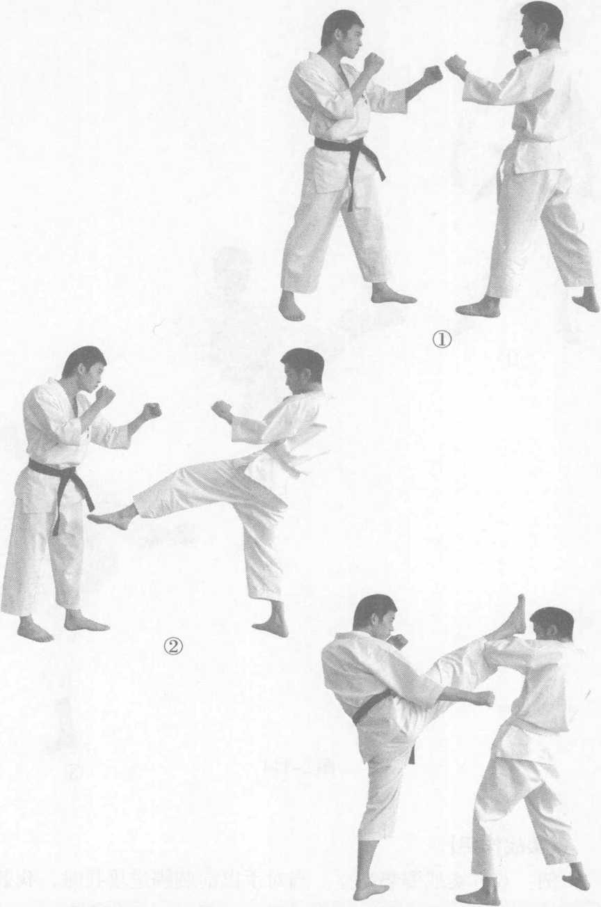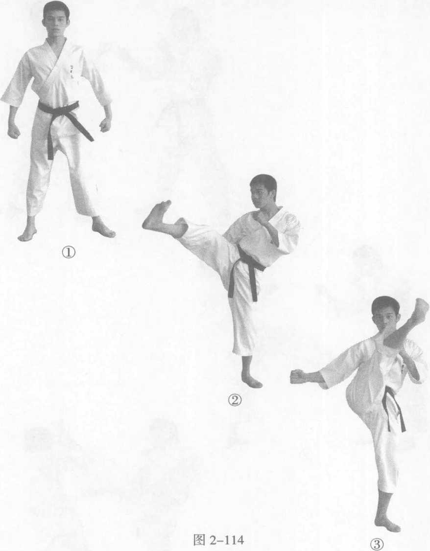 例:双方实战姿势站立。当对手以前刺踢进攻我时,我躲 闪后以月牙踢(里合腿)反击对手。(图2-115①②③)