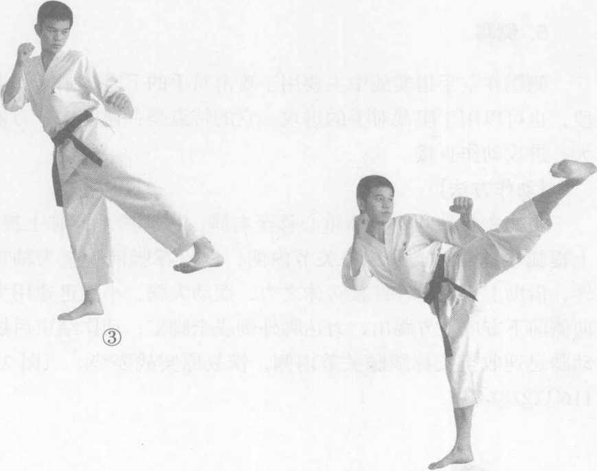 侧踢在空手道实战中主要用于攻击对手的下段、中段和上 段,也可以用于阻截对手的进攻。它的特点是:速度快、力量 大、进攻动作直接。