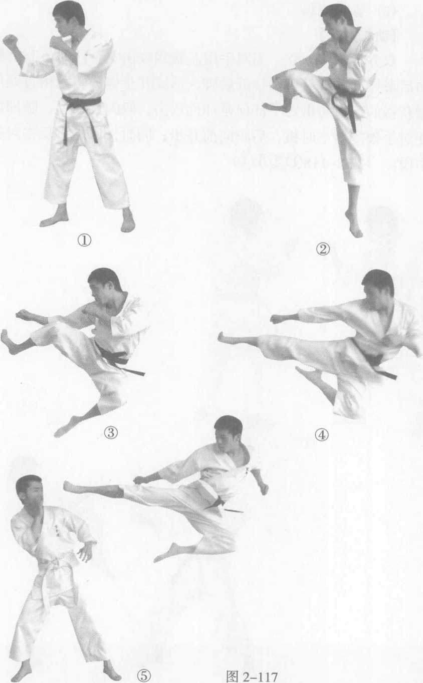 实战姿势站立。右脚向前上一步,身体直接向上跳起,在 空中借助身体前冲的惯性,右腿屈膝抬起;同时,右腿快速向 攻击目标踢出,以足刀或足跟踢击目标,目视攻击目标。(图 2-117①(2延④⑤)