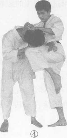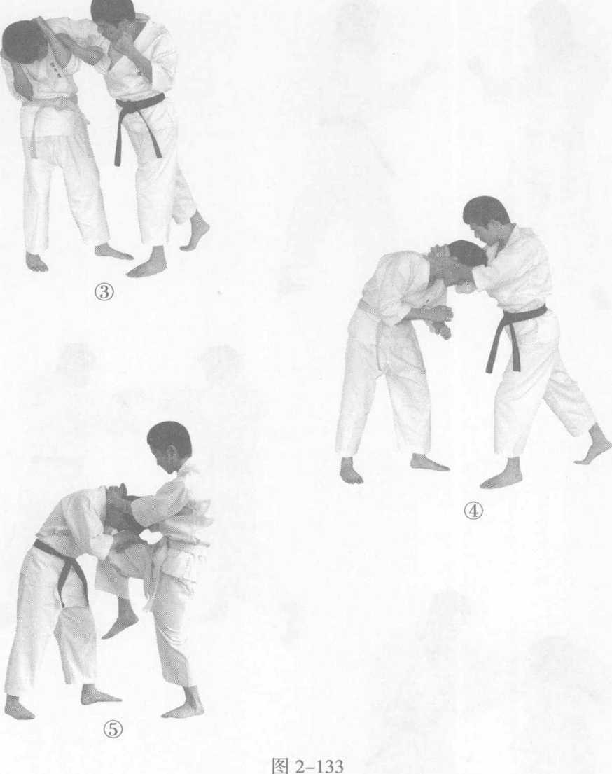 我找准机会,突然以左右肘摆 击对手头部;同时,双手搂住对手颈部,右腿屈膝向上攻击对 手头部或面部。(图2-133①@③④⑤)②例三:双方实战姿势站立。当对手以右拳攻击我上段时, 我用左手阻截对手;同时,左手抓住对手左前臂,右脚向前上 一步,右手按住对手颈部,左腿屈膝向上冲撞对手头部或面 部。(2—134①②③④)图 2-134