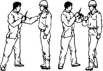 我自然站立或行走,敌在正前,向我上左步,其左手抓 握住我衣领,右手反握匕首指我颈(胸)部对我威胁(图4 一 391)。