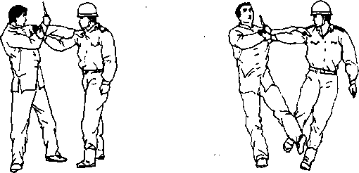 (2) 穿过后,右手外推(右小臂外格)敌右普肘关节