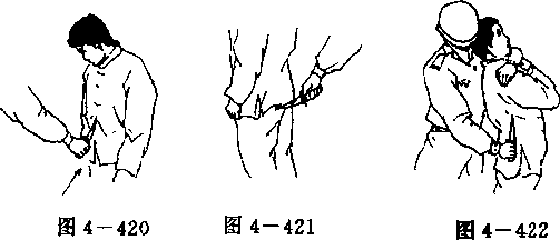 我在暴徒背后,左臂由暴徒左肩上伸过,锁住暴徒喉部。右手反握匕首,由下向上顶插暴徒右侧腰部(图4-422)(9)反握匕首由后控制我在暴徒背后,左手抓握住暴徒左肩,右手反握匕首,由 暴徒右肩上伸过,使匕首刃部紧贴于暴徒咽喉(图4—423)。(10)匕首格切在格斗中,暴徒起右腿攻击我腹部时,我右手反握匕首, 用匕首刃部由内向外格切暴徒右小腿(图4 — 424),如暴徒用 右直拳向我攻击时,也可用匕首刃部格切其右小臂(图4一425) .