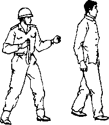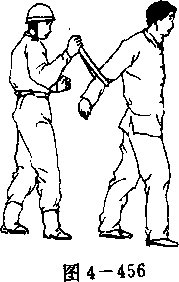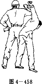 (2) 左手抓握住敌左手腕,同时右手上拉武装带(图4一 457);