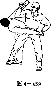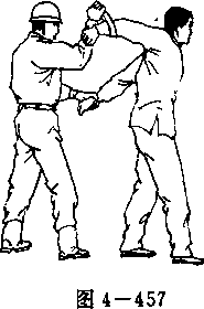 (3) 右脚向敌左脚前上一步,右臂屈肘,用大臂别住敌 右肘关节(图4-458、图4 - 459)