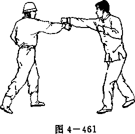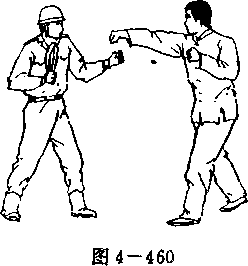 我在与敌格斗中,右手持武装带,敌在我正前,用右直 拳击我面部(图4-460).