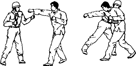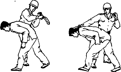 开始姿势:我在与敌格斗中,右手持武装带,敌在我正前,用右直 拳击我头部(图4 — 464)。制服动作顺序; .图 4—464 图 4一 465图 4-466 图 4—467<1)我立即向左侧前上左步,身体左闪,同时右手用武装带抽敌腹部(图4-465).(2)右.脚向后撤步,右手持武装带左上举'(图4-466);<3)由上向下抽击敌后颈部(图4 — 467)’动作要点:上步快,闪躲协调,抽腹及时,抽颈有力。