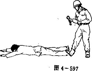 (1) 将敌制服后,命令敌原地俯卧,双腿分开,两臂前 伸,我右手持手铐在敌背后(图4—596);