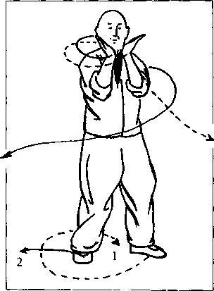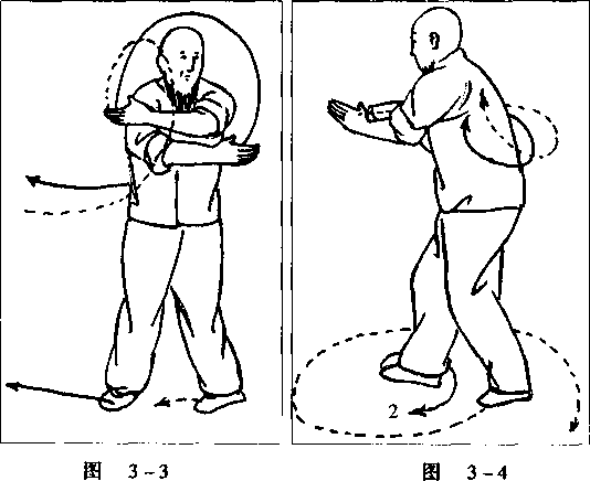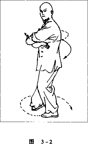 2 .左推磨势沿圈线转到北面左脚在前时停 步。上身向左拧腰姿势不变。右脚向前上一步, 且极力外旋摆步成错综八字步;向右转身,右掌 顺势插于左腋下(掌心向下),而左掌亦随右转身 向下向前向右划弧至右肘上(掌心向下),眼随左 手,两膝相拢,身微下蹲。如图3-2所示。