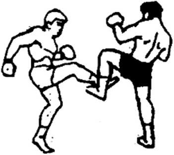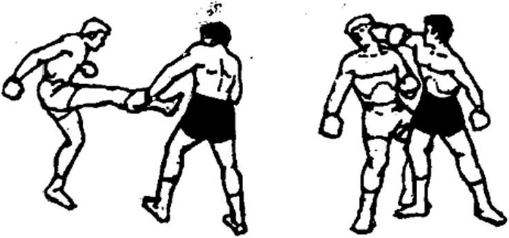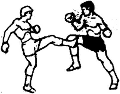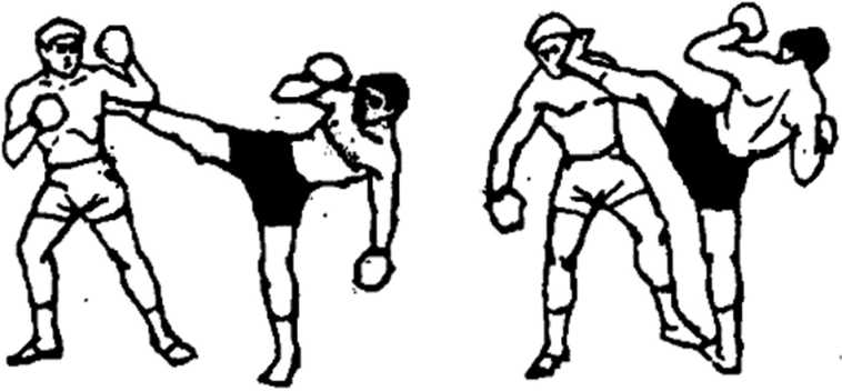 敌方前垫步,以左岫蹊我方裆腹部时,我方即左转体提右 膝扣防,随即右醐上拾侧扫踢敌方腰肋部,右脚落地时即复以左 脚蹬踢其胸、面部(或以左横撞膝攻击敌方软腹部)(图510、图 511、图 512) o