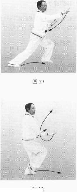 图30图30图31图31图32图32重心前移成右弓步,上体左转;左掌自右向左前方划弧平抹,掌心斜 向前下;右掌微向后划弧,收至左肘内侧下方。眼看左掌(图32)。