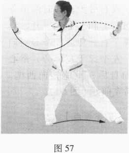 重心移向右腿,左脚尖内 扣,身体右转;右掌由左向右划 弧至身体右侧,两掌对称地分举 在身体两侧,两肘微屈,掌心向 外。眼看右掌(图57)。