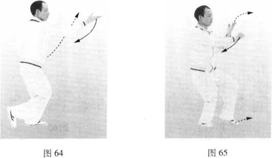 前掌着地落在左脚后面;左前臂内旋,左掌向左、向下划弧至体侧,掌心向 下;右掌向右、向前划弧拦至体前,前臂外旋,掌心斜向上,高与鼻平。眼看前 方(图64 )。