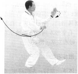 重心左移,上体左转,右脚尖随之内扣;随之右拳变掌,前臂外旋, 掌心转向上并向内掩裹,划弧左摆至体前;左拳同时变掌,掌心向下,外
