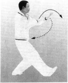 重心后移,右脚尖外撇;左掌翻转向上,微向后收;右掌经胸前从左 前臂上方向前穿出,掌心斜向下。眼看前方(图202)。