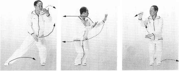 上体继续右转;左脚向左侧开步,脚尖仍向前;两掌云至身体右 侧,逐渐翻转,右掌心转向外;左掌云至右肘内侧,掌心转向内。目视
