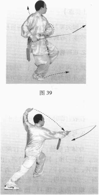 身体左转;左脚收至右脚内侧 (脚尖不点地);同时右手持剑,向下 卷收于右腰侧;左剑指亦随之翻转收 至腹前。眼转看左前方(图39 )。