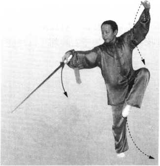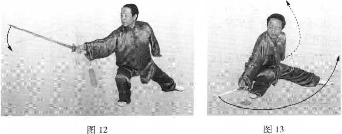 1 图11图11太 极 拳 规 范 教 程太 极 拳 规 范 教 程.左脚向左后方落步,右腿屈膝下蹲成仆步;同时左臂内旋,左剑指 经腰左侧向后反穿;随之右手持剑,略向下沉并外旋,使手心向上。目视 剑尖(图12、图13 )o图11图11太 极 拳 规 范 教 程太 极 拳 规 范 教 程2 .上体左转;左脚尖外撇,右脚尖内扣,左腿屈膝前弓成左弓步;同 时右手持剑,向上、向左横扫,手心向上,停于身体左前方;左剑指经左 后方摆至身体左上方。目视剑尖(图14 )。图14图14五、右左平带五、右左平带【要点】图14图14