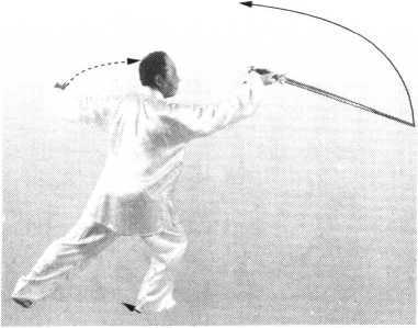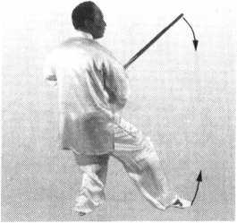左腿向后落下;右手持剑外旋上提;左剑指摆向身后。眼看前方(图 71 )0