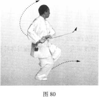 身体左转;左脚收至右脚内侧(脚尖不点地);右手持剑,随转体向 下卷收于右腰间,手心向上;左剑指也随之翻转收至腹前,手心向上。眼 看左前方(图80 )。