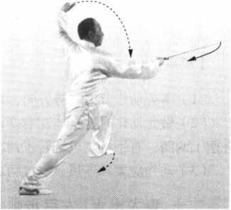 重心右移,左脚尖内 扣,右脚尖外展,身体右 转;同时右手持剑内旋向 上、向后抽绕至头侧,手 心翻转向外;左手剑指落 于右腕部,随剑一起回绕。 眼看剑尖(图79 )。