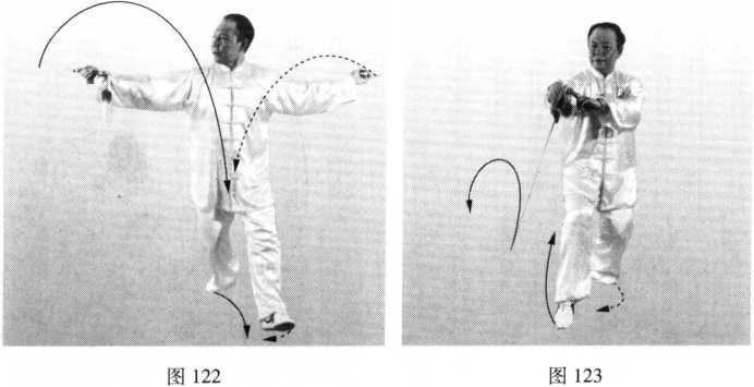 1 .上步举剑左脚向前上步,脚尖略外撇;同时两手向两侧分开,手心向上,剑尖 摆至身后。眼看右后方(图122 )。2 .虚步点剑右脚向前上步,脚尖点地成右虚步;同时右手持剑上举,经头上向前 下方点啄,剑尖斜向下;左剑指收至右腕部。眼看剑尖(图123)。【要点】上左脚时两臂尽量外展,右脚落地的同时点剑。点剑时伸臂、提腕, 本势方向为正南。第六段