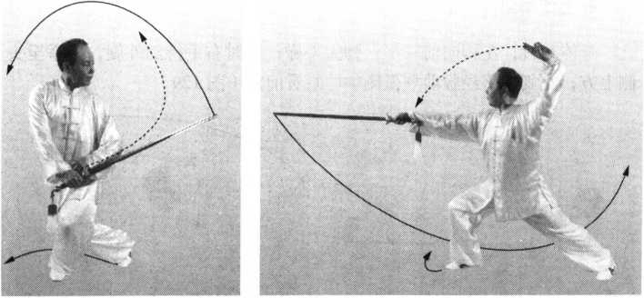 (2)挂剑是将剑尖经身体右侧或左侧由前向后勾回,目的是勾挂开对 方的进攻。