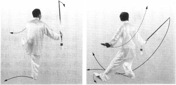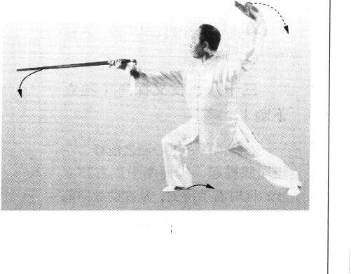 3.弓步撩剑3.弓步撩剑身体继续左转;右脚前 进一步,重心前移成右弓 步;同时右手持剑,由下向 前划一立圆,反手立剑向前 撩出,手心向外,高与肩 平;左剑指向上绕至左上 方。眼看前方(图135)。