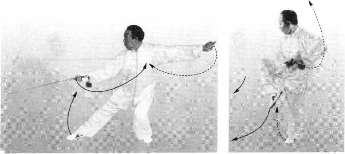 太 极 拳 规 范 教 程太 极 拳 规 范 教 程左腿屈膝后坐,重心移至左腿,右腿屈膝提起,脚面绷平成左独立 步;同时右手持剑,由前向后拉;左剑指划弧下落至右手背下,双手将剑 捧于左肋间,剑尖斜向下,手心均向上。眼看剑尖(图136、图137)。太 极 拳 规 范 教 程太 极 拳 规 范 教 程【要点】提膝与捧剑要同时完成。右膝 的方向应向正西。