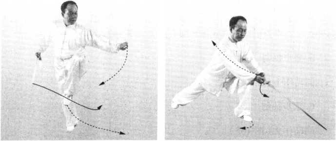 左脚提起,右脚碾转,身体向左后转身,左脚向前(东南)落步成左 弓步;同时右手持剑,由腰间向前下方刺出,手心向上,剑尖指向斜下 方;左剑指向左后摆经左腰间前伸,附于右腕部。眼看剑尖(图166、图 167 )。太 极拳规 范教程太 极拳规 范教程图166 图167图166 图167【要点】【要点】太 极拳规 范教程太 极拳规 范教程图166 图167图166 图167【要点】【要点】(1)转动时立腰顶头,剑尖稍内收。弓步与刺剑一致,均为东南方。(2)本势向左后转身约90。。第八段