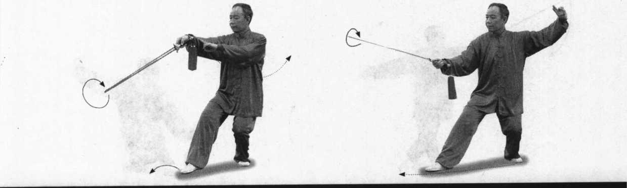 ② 绞剑为平剑沿逆时针方向在胸前划弧一周,手心朝上,剑尖向前,力点 在剑刃前端。绞剑时腕关节要松活,与剑尖对称划圈。
