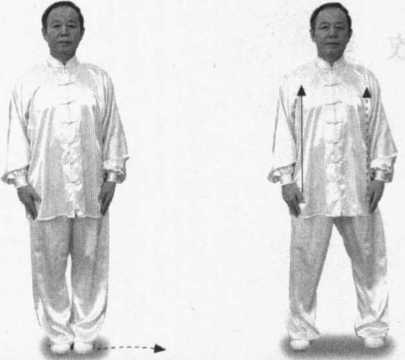 ② 开立步时,应抓住“轻起轻落,点起点落”这个步法规律,先将重心移 至右腿,左腿放松,然后轻轻提起左脚跟,以不超过右踝的高度向左分升半步。 落脚时前掌先着地,并且使脚尖朝正前方,随之全脚掌逐渐踏实。