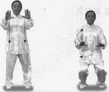 ⑤ 两掌下按时手心朝下,要有主动下按的动作,按到两手与腹同高时,须 展掌、舒指。